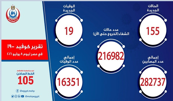 أعلنت وزارة الصحة والسكان، مساء الخميس، تسجيل 155 حالة إيجابية جديدة بفيروس كورونا ووفاة 19 شخصا جراء الإصابة بالمرض.