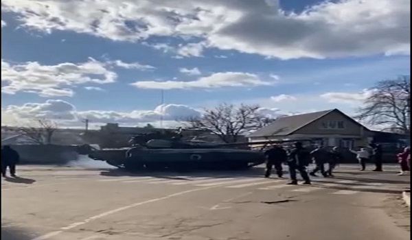 أظهرمقطع فيديو تم تداوله على مواقع التواصل الاجتماعي مواطنين أوكرانيين يقفون أمام الدبابات الروسية في محاولة لوقف تقدمهم، وفي الفيديو، يمكن رؤية الدبابات وهي تسير على الطرق في باخماش، على بعد ما يزيد قليلاً عن 110 أميال شمال شرق العاصمة الأوكرانية كييف.