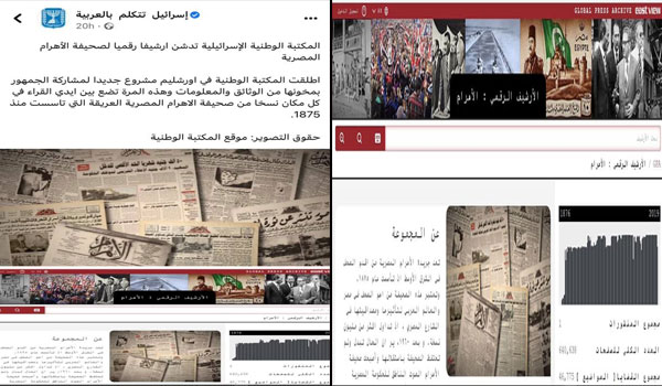 ونشرت صفحة “إسرائيل تتكلم بالعربية”، تدوينة كتبت خلالها “المكتبة الوطنية الإسرائيلية تدشن أرشيفا رقميا لصحيفة الأهرام المصرية”.. مضيفة “أطلقت المكتبة الوطنية في أورشليم مشروعًا جديدًا لمشاركة الجمهور بمحتواها من الوثائق والمعلومات”.