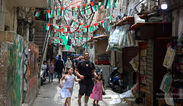 في الأزقة الضيقة لمخيم شاتيلا، حيث باتت الأحداث الأخيرة الشغل الشاغل لسكان فاقم الانهيار الاقتصادي في لبنان من معاناتهم وزاد أوضاعهم المعيشية سوءاً، يحمل الأطفال أعلام فلسطين في طريقهم إلى المدرسة. وتردد نساء الدعاء لنصرة قضيتهم.