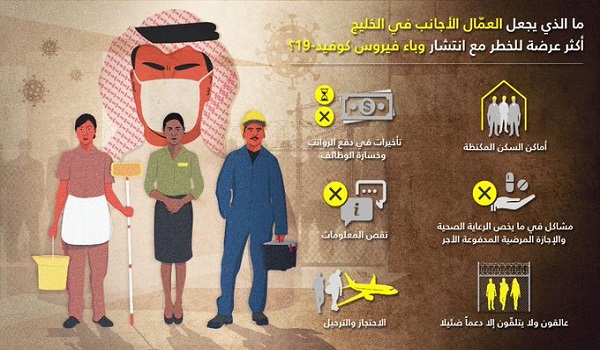 وفسرت المنظمة الأسباب التي تجعل العمال الأجانب في الخليج أكثر عرضة للخطر مع انتشار فيروس كورونا المستجد، ومن بينها: أماكن السكن المكتظة، والتأخيرات في دفع الرواتب، وخسارة الوظائف.