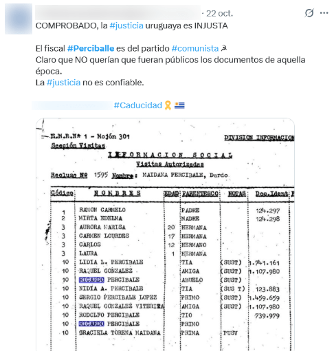 Los ataques coordinados alegan que la Justicia uruguaya es “injusta” y que los pedidos de procesamiento se hacen “sin pruebas suficientes”, en un intento de minimizar los crímenes practicados por el régimen militar. Entre las acusaciones diseminadas en redes, publicaciones alegan supuestos lazos familiares de Perciballe con integrantes de grupos armados de izquierda.