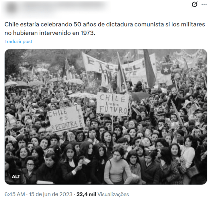 Al igual que en Brasil y Uruguay, hay publicaciones virales en redes sociales que afirman que, al intervenir, los militares liberaron a Chile de una amenaza mayor. La siguiente publicación, por ejemplo, hecha en X el 15 de junio de 2023, dice que Chile estaría celebrando 50 años de “dictadura comunista” si los militares no hubieran intervenido. La publicación alcanzó 22,4 mil visualizaciones.
