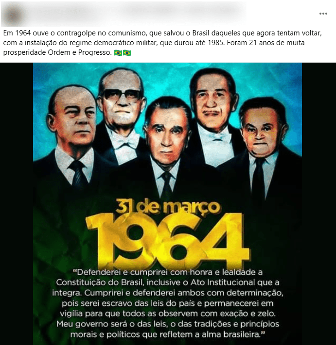 Una publicación en Facebook hecha el 31 de marzo de 2022, por ejemplo, muestra imágenes de los cinco presidentes del régimen militar brasileño sobre la fecha “31 de marzo de 1964” en letras amarillas. El pie de foto dice que ese año hubo un “contragolpe al comunismo” y que el período militar fue de “21 años de mucha prosperidad, Orden y Progreso”. En los comentarios, hay personas que dicen que esa fue “la mejor época” y piden la vuelta del régimen militar.