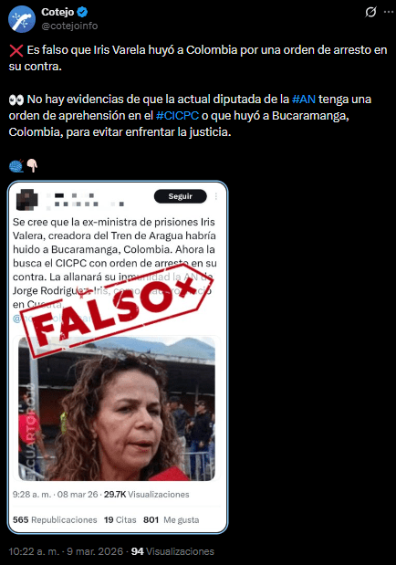 No obstante, este contenido es falso, ya que no existe reporte oficial alguno de la supuesta orden de arresto del Cuerpo de Investigaciones Científicas, Penales y Criminalísticas (Cicpc). Además, la desinformación se basa en reseñas de medios de comunicación que advierten que Varela podría enfrentar consecuencias legales futuras por sus actuaciones al frente del ministerio de Servicios Penitenciarios; sin embargo, dichos reportes no afirman que será detenida próximamente.