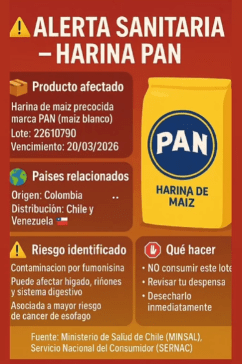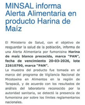 “El Ministerio de Salud, con el objetivo de resguardar la salud de la población, informa de una Alerta Alimentaria por fumonisina Harina de maíz blanco precocida, marca “PAN”, fecha de vencimiento 20-03-2026, lote 22610790, marca “PAN”.”