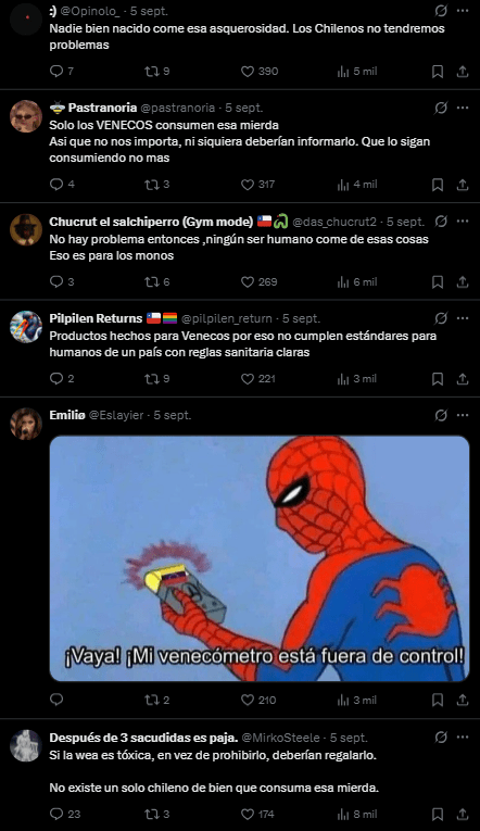Más allá del debate nutricional, en el post de X del Ministerio de Salud chileno, en el que hace la advertencia de este lote de Harina PAN, hay insultos xenofóbicos y deshumanizantes hacia la comunidad venezolana, en los que aseguran que “los chilenos no tendrán esos problemas”, reforzando narrativas y discursos de odio contra los migrantes venezolanos en ese país.