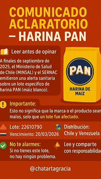 Aunque la imagen recibida en nuestro chatbot, publicada por la cuenta de Instagram @chantaltagracias el 4 de octubre de 2025, describe que este lote fue despachado en Chile y Venezuela, al hacer una búsqueda en Google de palabras clave (alerta sanitaria + harina pan + Venezuela) no hallamos alerta oficial del Ministerio de Salud de Venezuela.