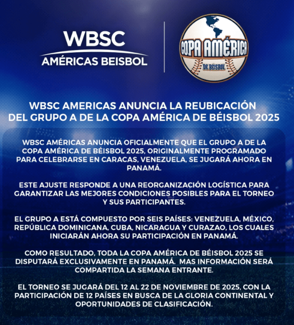 La Confederación Mundial de Beisbol y Softbol (WBSC) confirmó este jueves que la sede de la primera Copa América de Beisbol, para el grupo A, ya no será Venezuela, sino Panamá, luego de haberse presentado «problemas logísticos» que han impedido garantizar las condiciones necesarias para albergar el evento, según informó el ente deportivo en un comunicado oficial.