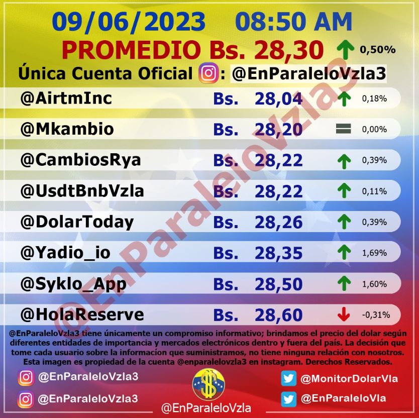 El viernes 9 de junio el precio del dólar paralelo abrió en 28,30 bolívares por cada divisa según publicó Monitor Dólar a través de su cuenta en Instagram.