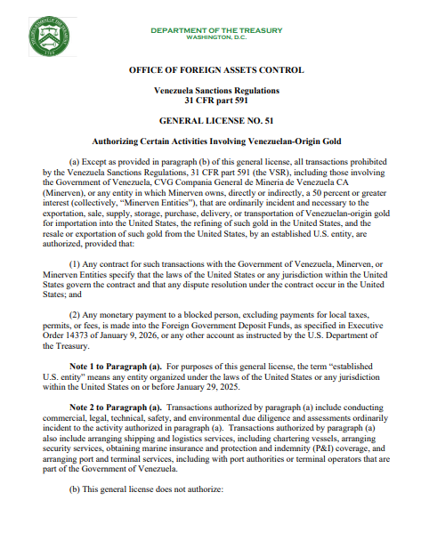 La Oficina de Control de Activos Extranjeros (Ofac) del Departamento del Tesoro de Estados Unidos publicó este viernes la Licencia General No. 51, que permite ciertas operaciones con oro de origen venezolano que anteriores sanciones impuestas por el gobierno norteamericano prohibían de forma ordinaria.