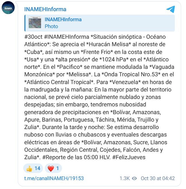 El Instituto Nacional de Meteorología e Hidrología (Inameh) publicó este jueves en su canal oficial de Telegram el boletín meteorológico, en el que pronostica que durante la madrugada y la mañana, se espera cielo parcialmente nublado y zonas despejadas en la mayor parte del territorio nacional. Sin embargo, entre el mediodía y la tarde se prevé nubosidad generadora de precipitaciones en los estados Bolívar, Amazonas, Apure, Barinas, Portuguesa, Táchira, Mérida, Trujillo y Zulia.