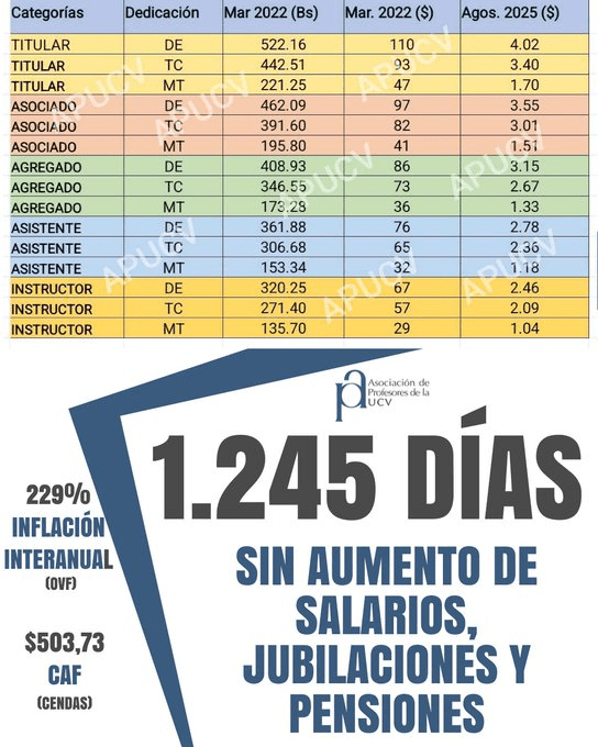 La Apucv alerta que un profesor titular con dedicación exclusiva percibe apenas 4,02 dólares al mes, mientras que un instructor a medio tiempo no supera los 1,04 dólares.
