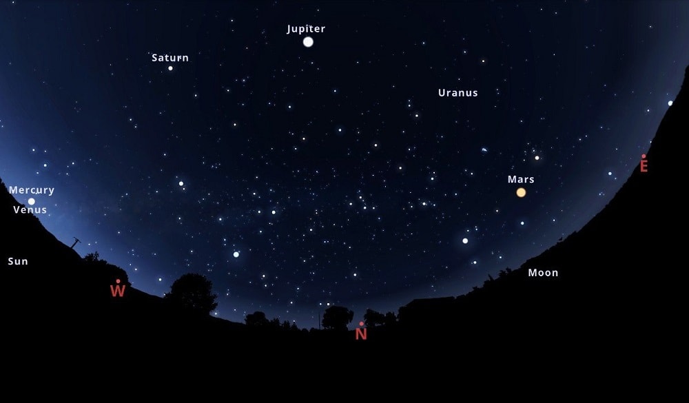 Por el este, irá apareciendo Marte; yendo más arriba al oeste estarán Júpiter y Saturno y finalizando al horizonte estarán Mercurio y Venus.