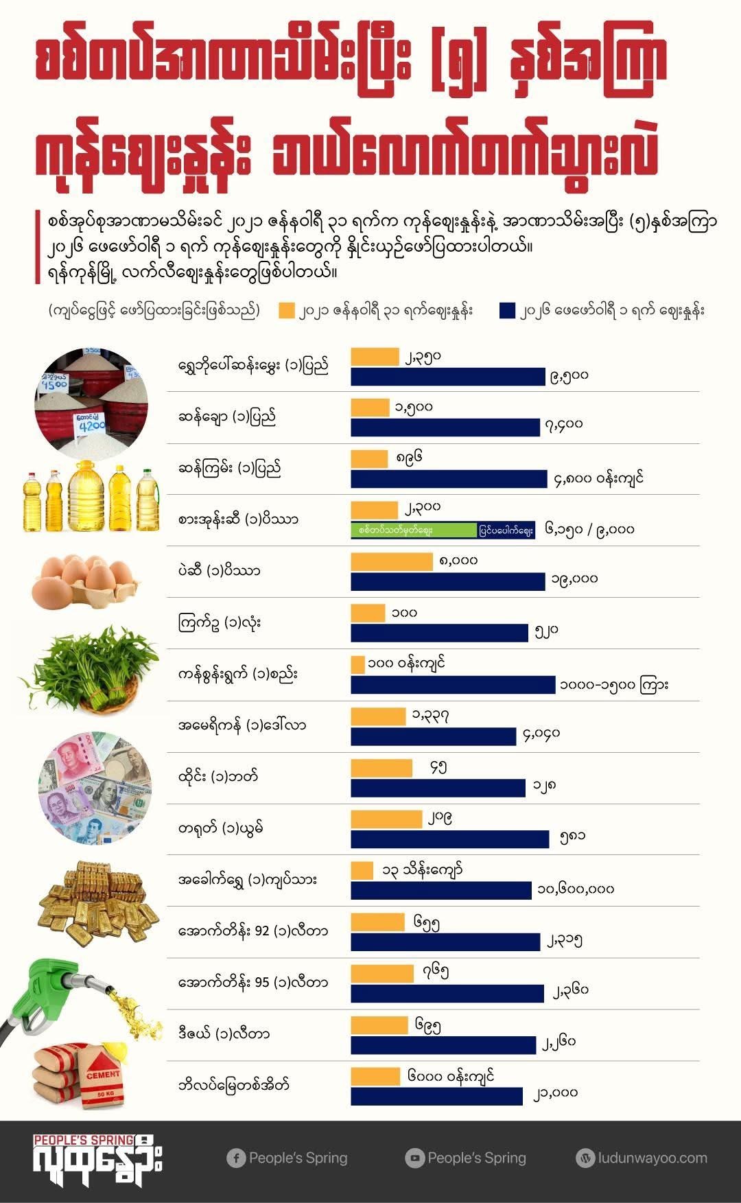 စစ်တပ်အာဏာမသိမ်းခင် ၂၀၂၁ ဇန်နဝါရီလ ၃၁ ရက်နေ့ရန်ကုန်မြို့ရဲ့ဈေးနှုန်း နဲ့ စစ်တပ်အာဏာသိမ်းပြီး ငါးနှစ်အကြာ ၂၀၂၆ ဖေဖော်ဝါရီ ၁ ရက်ဈေးနှုန်းတွေကို နှိုင်းယှဥ်ဖော်ပြပေးလိုက်ပါတယ် ။